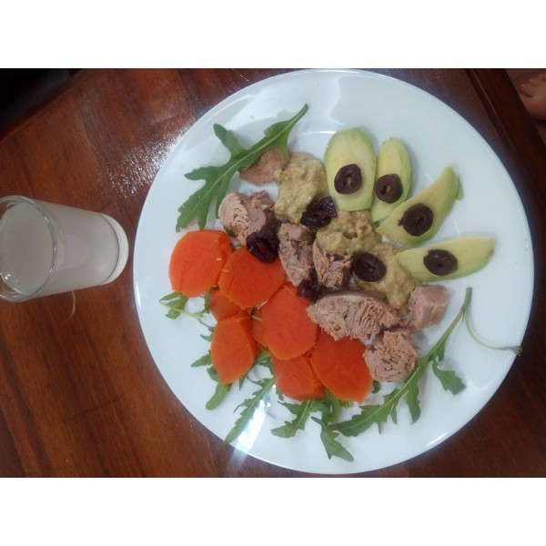 Cartofi dulci la aburi, ton in apa, avocado si sos din seminte de dovleac, caju, ulei de cocos, mustar, sare de Guerande, piper si Ulei esential de Bergamota fara furocumarine (1 picatura la 500 ml sos), un pahar cu colagen cu uleiuri esentiale ... bucurie maxima!